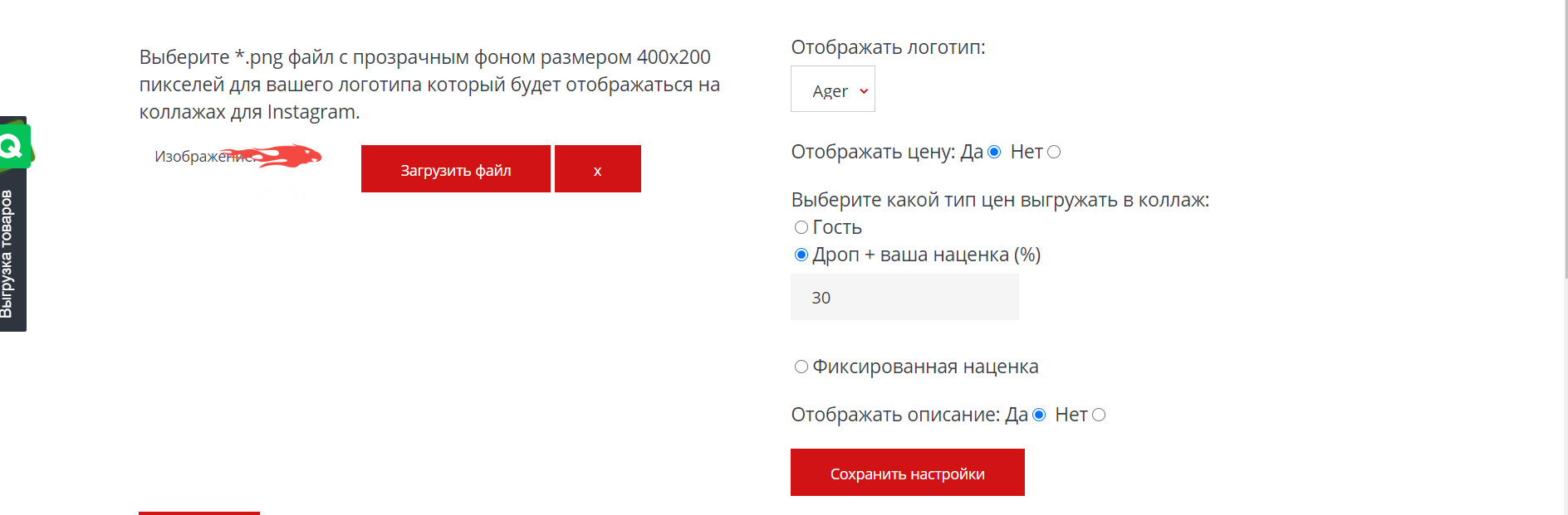 Далее на скриншоте пример настроек с использованием логотипа, наценки 30 % и отображением описания: