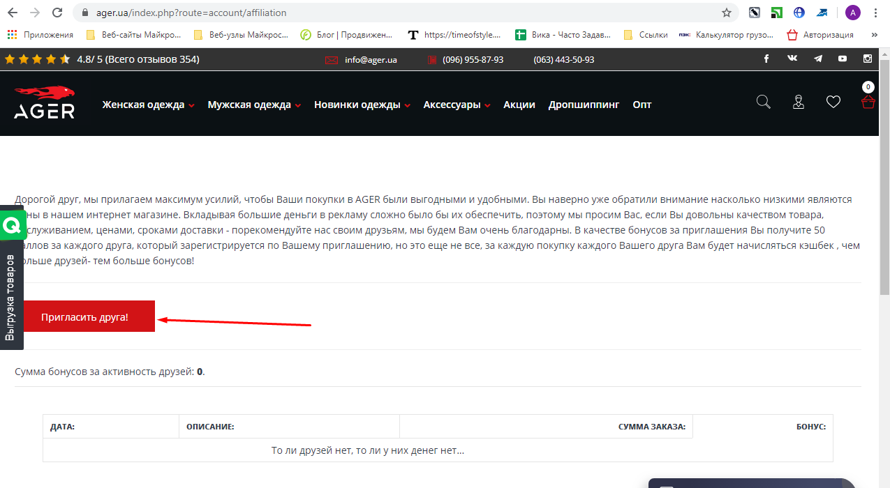 Дорогие друзья, мы прилагаем максимум усилий, чтобы Ваши покупки в AGER были выгодными и удобными. Вы наверно уже обратили внимание насколько низкими являются цены в нашем интернет магазине.Мы не вкладываем большие деньги в рекламу, вместо этого предпочитаем дарить Вам эти деньги в виде скидок. Именно поэтому, если Вы довольны качеством товара, обслуживанием, ценами, сроками доставки - порекомендуйте нас своим друзьям, мы будем Вам очень благодарны. В качестве бонусов за приглашения Вы получите 50 баллов за каждого друга, который зарегистрируется по Вашему приглашению, но это еще не все, за каждую покупку каждого Вашего друга Вам будет начисляться кэшбек , чем больше друзей- тем больше бонусов!"