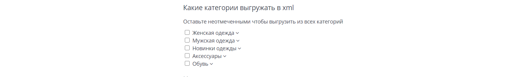 У першому блоці налаштувань вам доступні для вибору категорії товарів, з яких потрібно імпортувати товари в XML. Для вибору конкретної категорії встановіть чекбокс (галочку) напроти неї:
